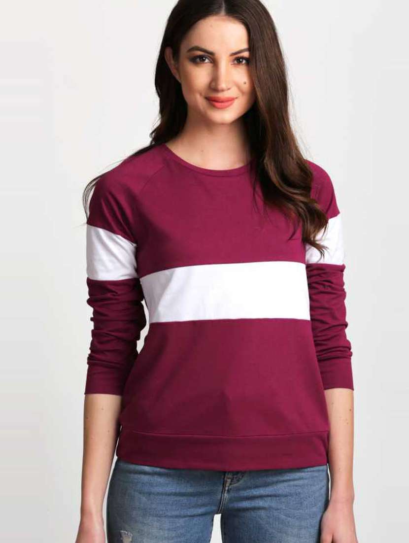 Gespo Maroon & White Colorblocked Round Neck Full Sleeve T-Shirt