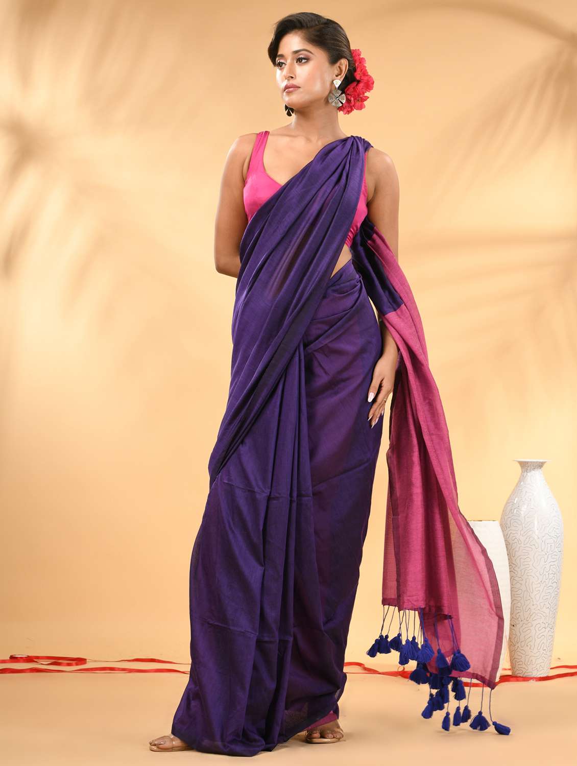 Celebrate timeless elegance with this beautifully crafted cotton handspun saree, designed to elevate your wardrobe. The saree features a stunning combination of purple and pink hues, seamlessly blending contemporary style with traditional charm. Its lightweight, breathable cotton handspun fabric ensures comfort all day long, making it perfect for both festive occasions and daily wear. The saree is adorned with delicate tassel detailing on the edges, adding a touch of sophistication. Pair it with traditional jewelry for a complete look.