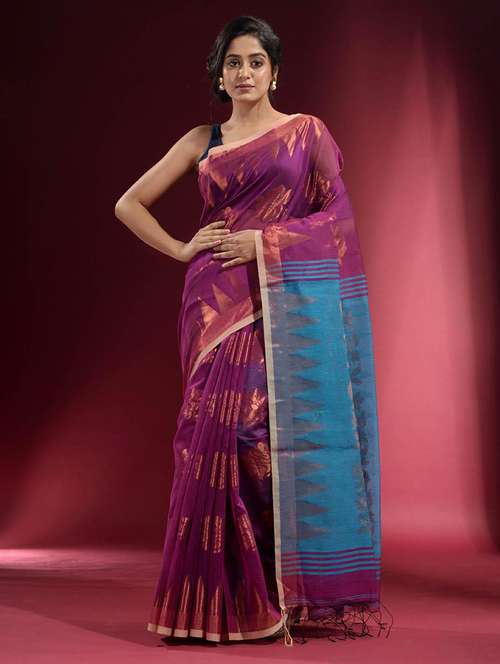 Spread your beautiful charm in this iris purple blended cotton handwoven saree. It has bold floral motifs woven with zari all over and the borders have temple patterns. It accompanies a cobalt blue pallu with floral zari designs to bring the whole look together.