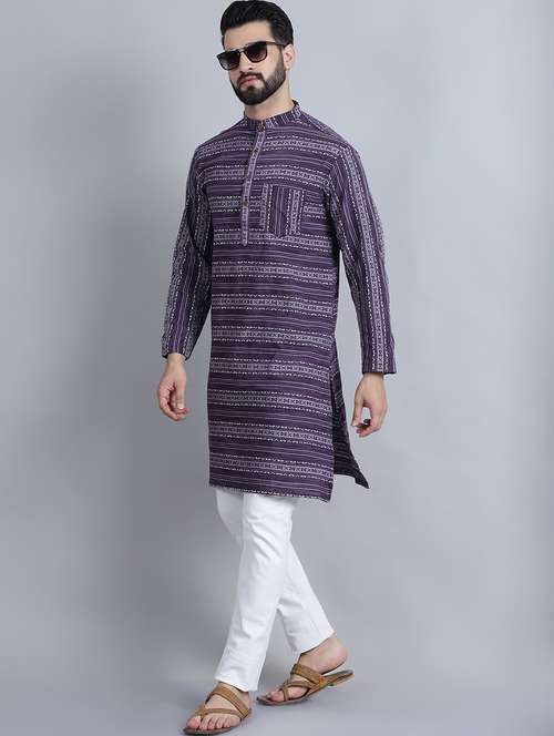 Enchanted Drapes Purple Printed Men's Cotton Long Kurta