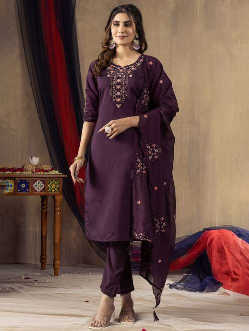 - Find gorgeous sets of ethnic wears in trending designs in purple colors suitable for festive wear of occasions.
