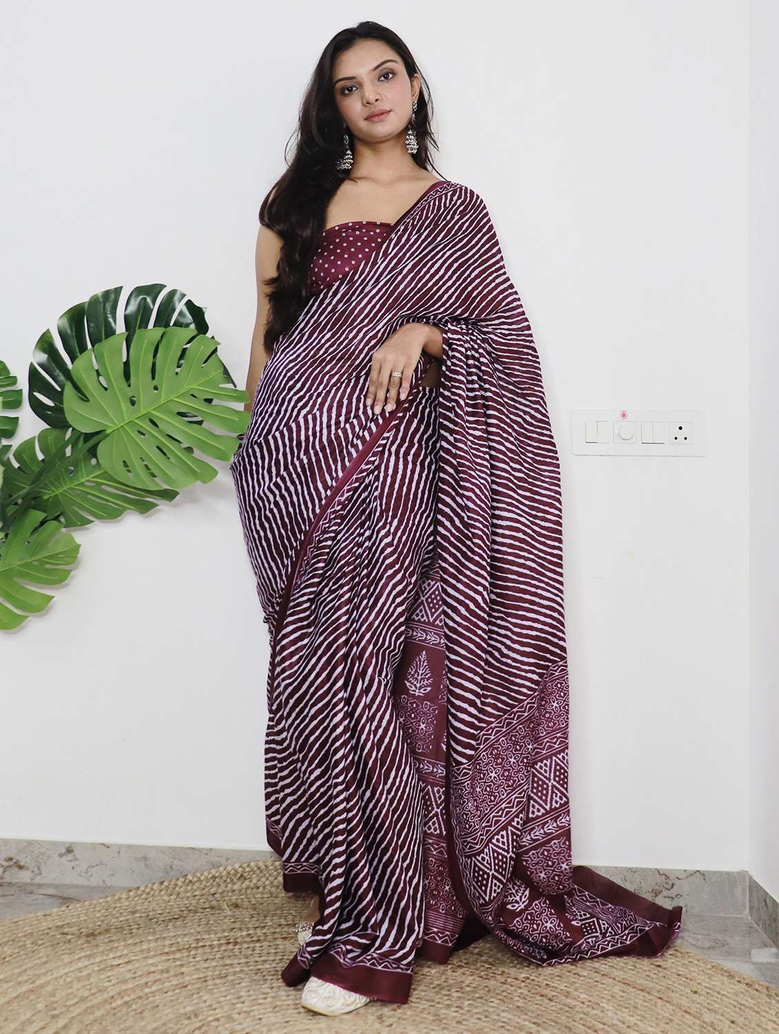 Embrace the latest fashion trends by owning this purple saree from Mull Sutra. Tailored to sartorial perfection from premium quality fabric, it assures a soft and soothing touch against the skin. It emanates a striped pattern which makes it a unique choice. It also comes with an unstitched blouse piece