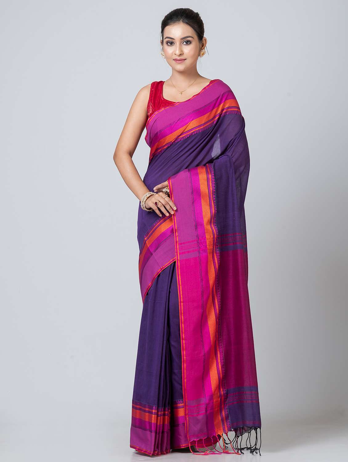 Puku Pure Cotton Purple naksha border saree with blouse fabric