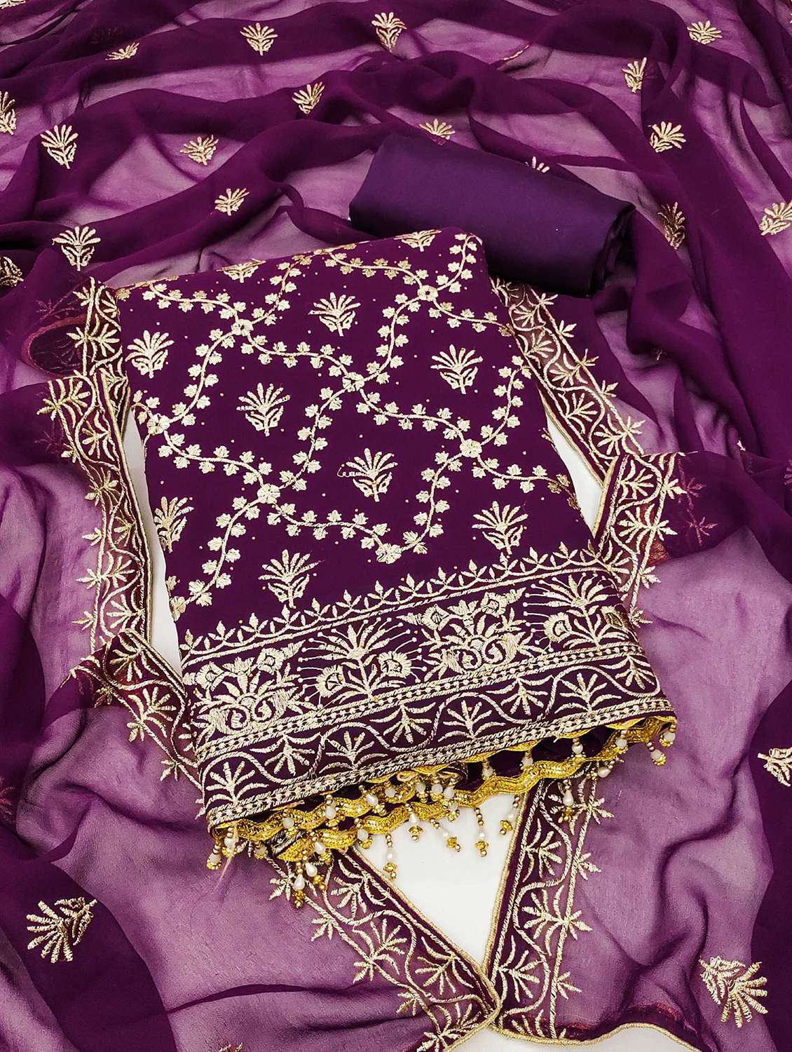 • Look ultra gorgeous in unstitched suits from Leeli Peeri Designer and grab these beautiful suits in purple colour.
