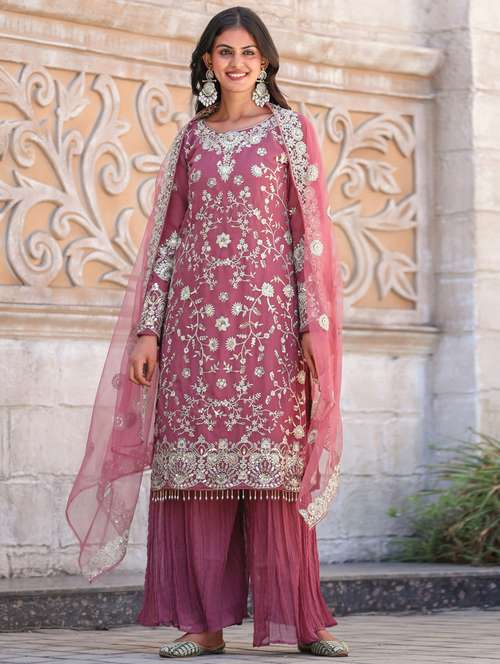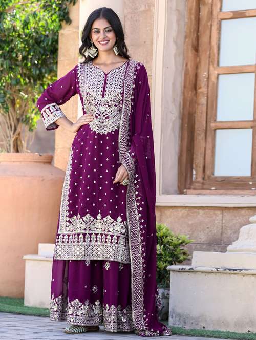 - Find gorgeous sets of ethnic wears in trending designs in purple colors suitable for festive wear of occasions.