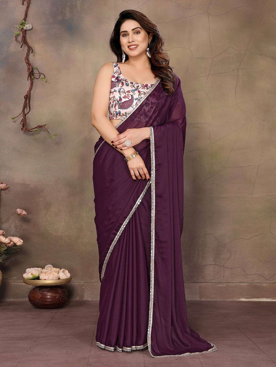 This rich Wine georgette saree is designed with a solid base and highlighted by a shimmering mirror work lace border, giving it a striking yet elegant appeal. The lightweight georgette fabric drapes beautifully, offering comfort and a fluid fall for extended wear. Paired with an unstitched Banglory silk blouse featuring digital prints, it allows you to customize the look to suit your personal style. Perfect for festive occasions, casual gatherings, or daytime events, this saree blends subtle charm with eye-catching detailing for a graceful appearance.