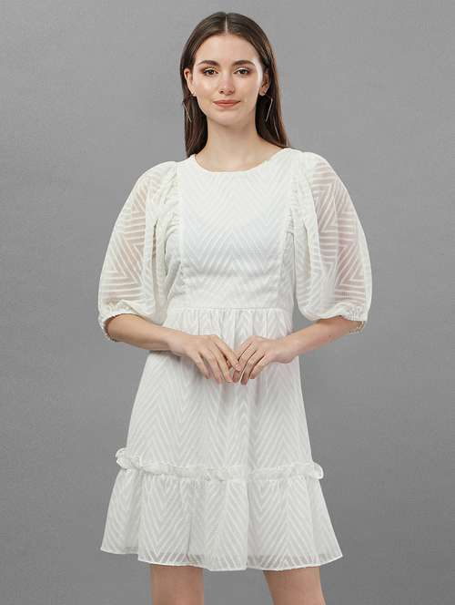 Customer Will Get One Top. Top Fabric Is Woven Georgette, Stitched With Have ¾ Sleeves. Self Design Striped, Dobby Weave, Puff Sleeves, Tie-Ups. Enhance the style factor of your wardrobe with this stylish dress.
