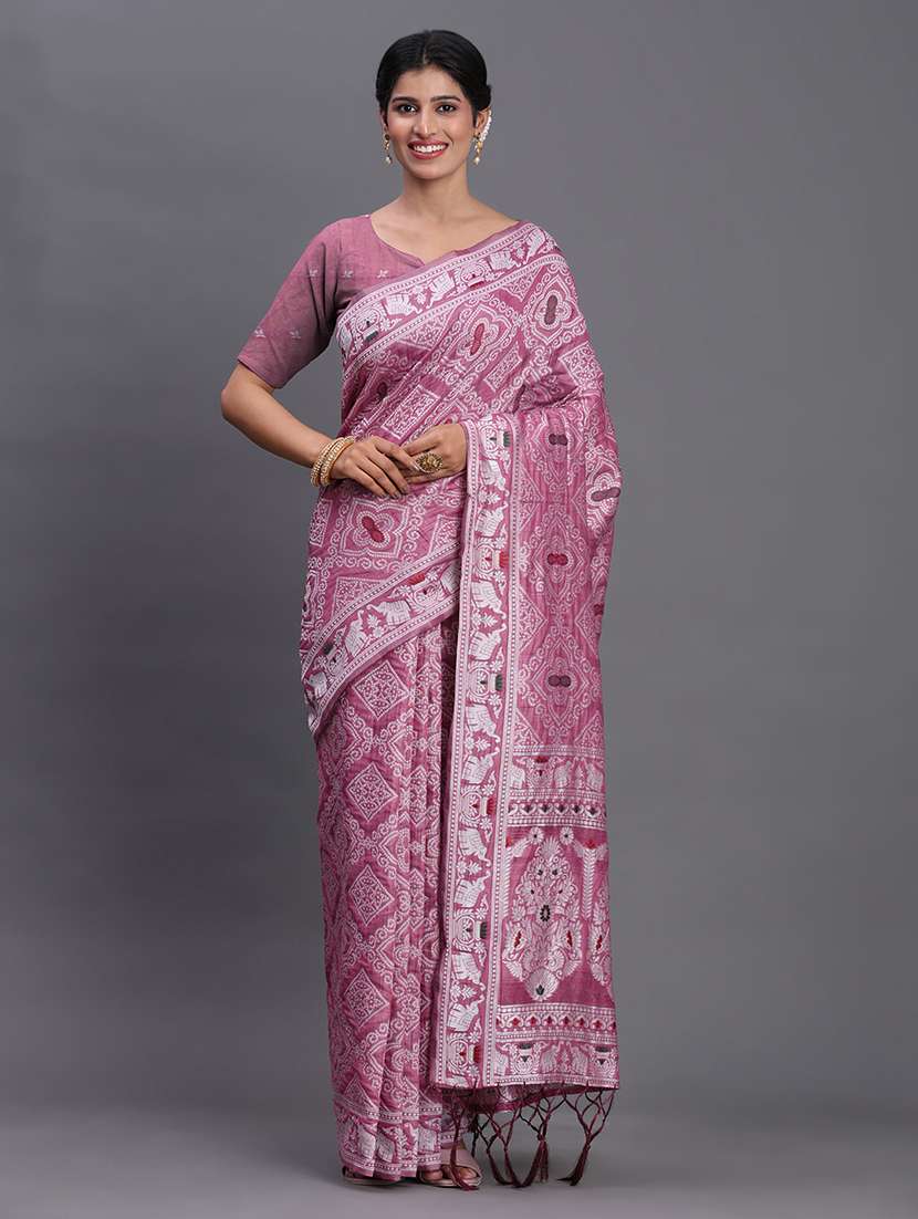 Celebrate heritage in style with this Purple linen cotton saree featuring a striking grid of multicolor motifs including elephants, temples, and tribal patterns. The intricate woven pallu and border elevate its ethnic charm, while the breathable fabric ensures all-day comfort. Tassel detailing and a contrast blouse piece complete the look — perfect for festive gatherings, pujas, or office ethnic days.
