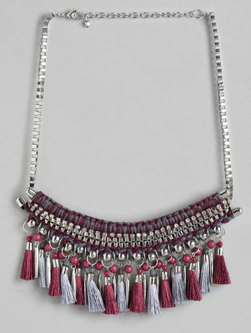 purple & silver-toned tasselled statement necklace
