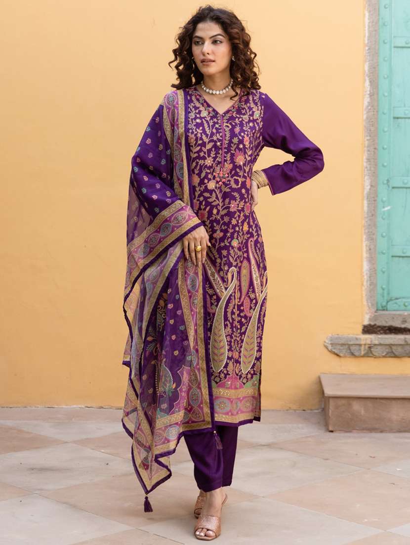 - Find gorgeous sets of ethnic wears in trending designs in purple colors suitable for festive wear of occasions.