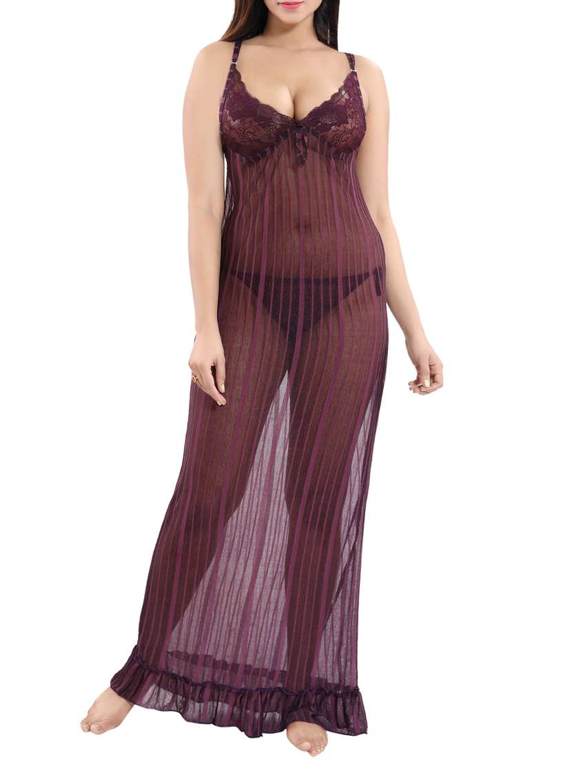 This Power Net Nighty / Night Dress with Panty from Be You is the ulimate blend of comfort & style. br The nighty has adjustable shoulder straps, elastic at the back for perfect fitting. Has ruffles details at the bottom. br Size: Free (S-L; comfort fit to bust 30-36 inches) br Length: Full (approx 55 inches) br Sales Package: 1 Nighty & 1Matching Panty