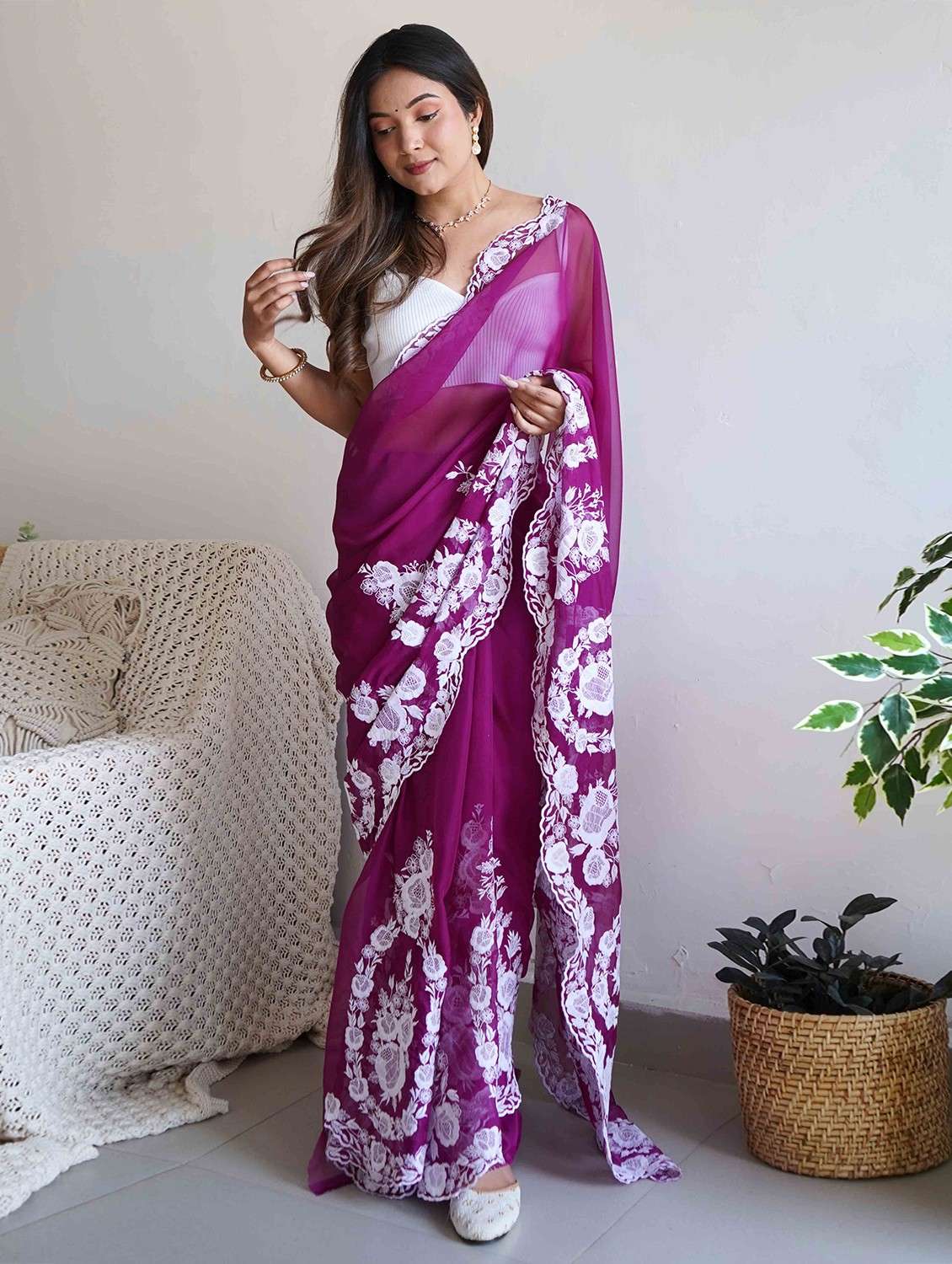 This Wine saree is beautifully detailed with floral thread embroidery, creating a festive and eye-catching look. Made from soft georgette fabric, it offers a lightweight, comfortable drape. The saree is paired with an unstitched satin blouse piece, giving you the flexibility to tailor it as per your style. Perfect for parties, weddings, and special occasions.