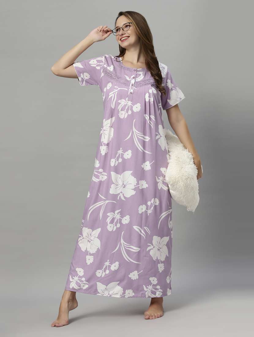 Introducing Quira's Women's Floral Lounge Wear Gown in a sophisticated shade of light purple. This elegant gown is crafted from high-quality POLLY COTTON, ensuring a soft and breathable feel perfect for all-day lounging. The beautiful flower print and half sleeves add a touch of charm and elegance to your loungewear collection, making it suitable for both casual relaxation and as comfortable nightwear. The regular fit and round neck design provide a flattering and comfortable fit, while the long length offers extra coverage and warmth for those cozy moments at home. Whether you're unwinding after a long day or simply enjoying your downtime, this lounge wear gown from Quira ensures you do so in style and comfort.