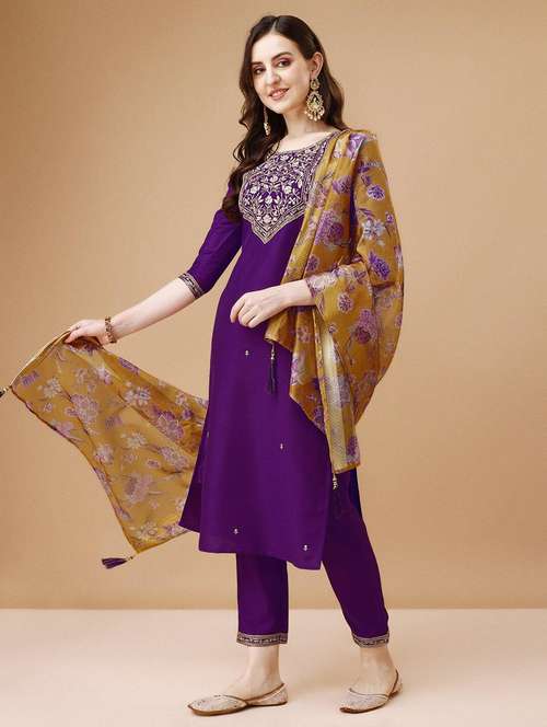 - Find gorgeous sets of ethnic wears in trending designs in purple colors suitable for casual wear of occasions.
