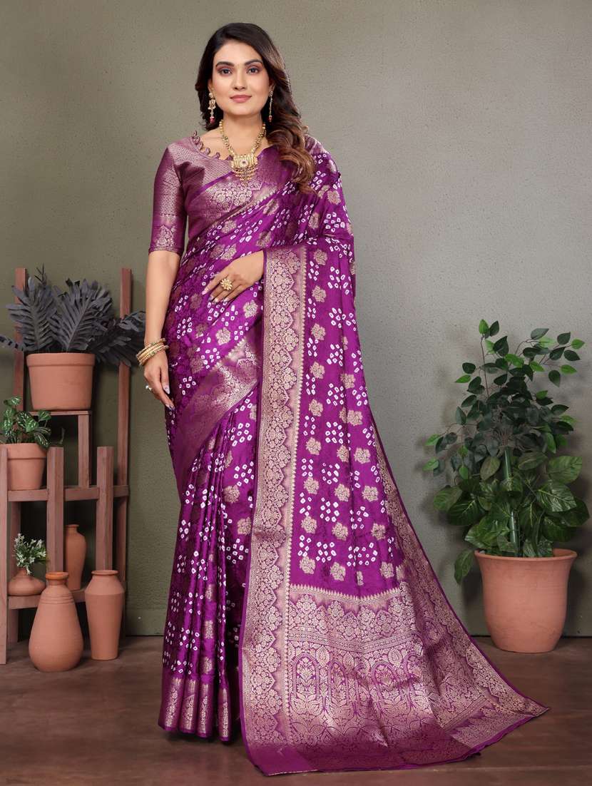 Purple Handmade Bandhej Satin Silk Saree With Zari Weaving Border