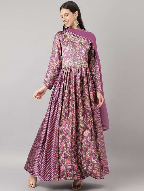 - » purple printed embroidered flared kurta & dupatta dress