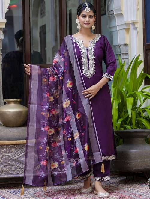- Find gorgeous sets of ethnic wears in trending designs in purple colors suitable for festive wear of occasions.