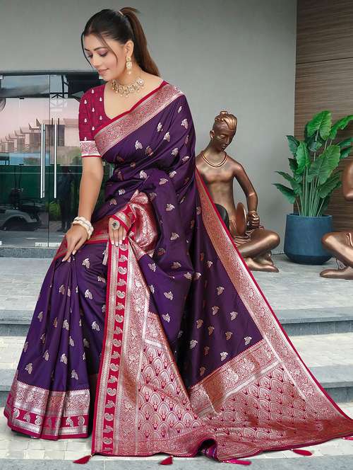 Purple Banarasi Silk Saree with Red Contrast Border & Heavy Golden Zari Weaving