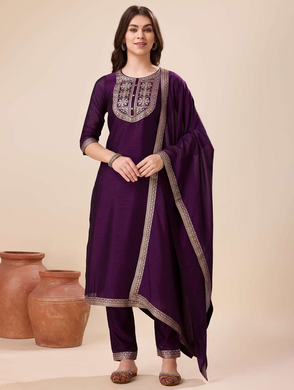 - Find gorgeous sets of ethnic wears in trending designs in purple colors suitable for festive wear of occasions.