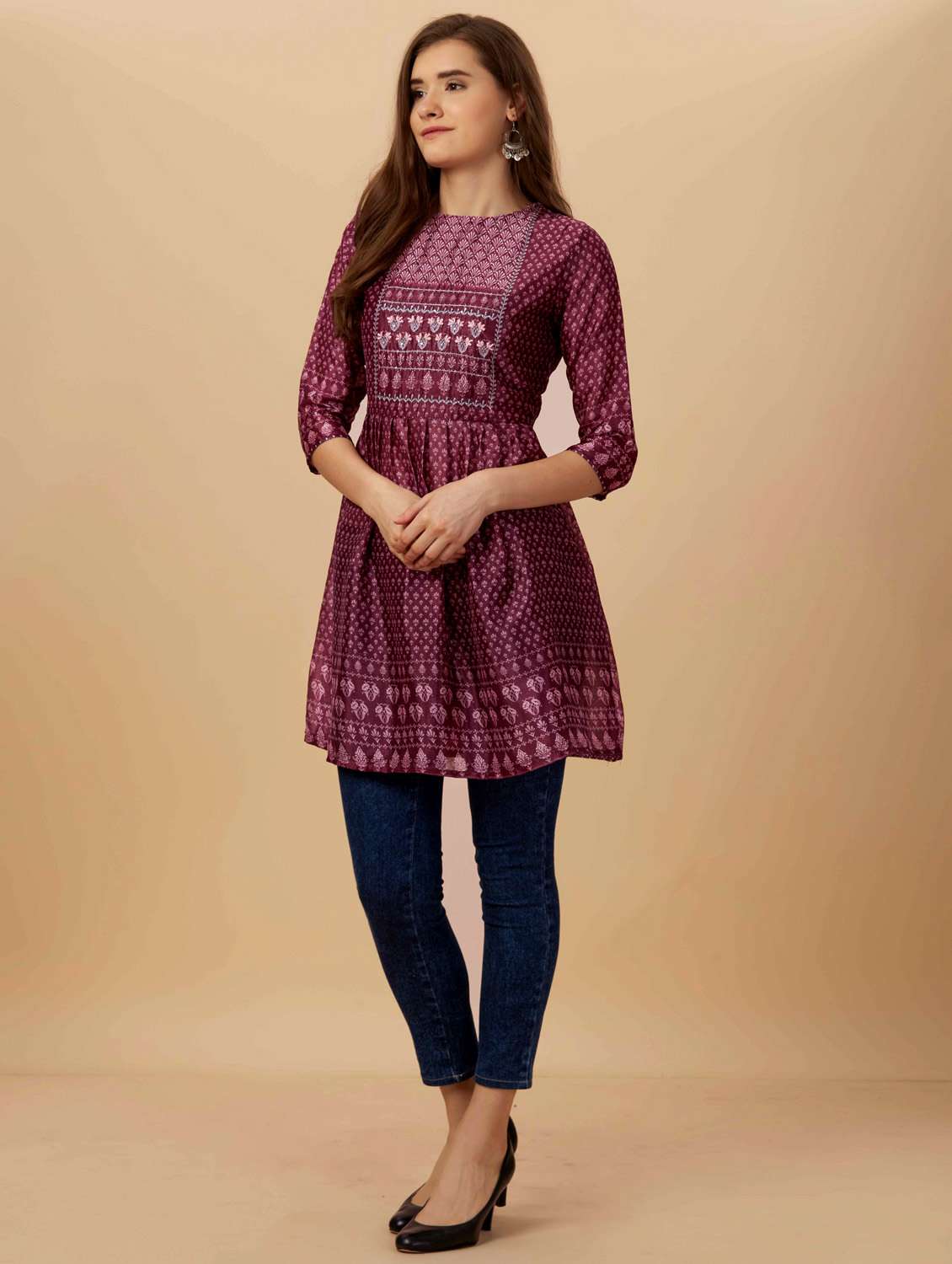 women purple round neck flared kurti
