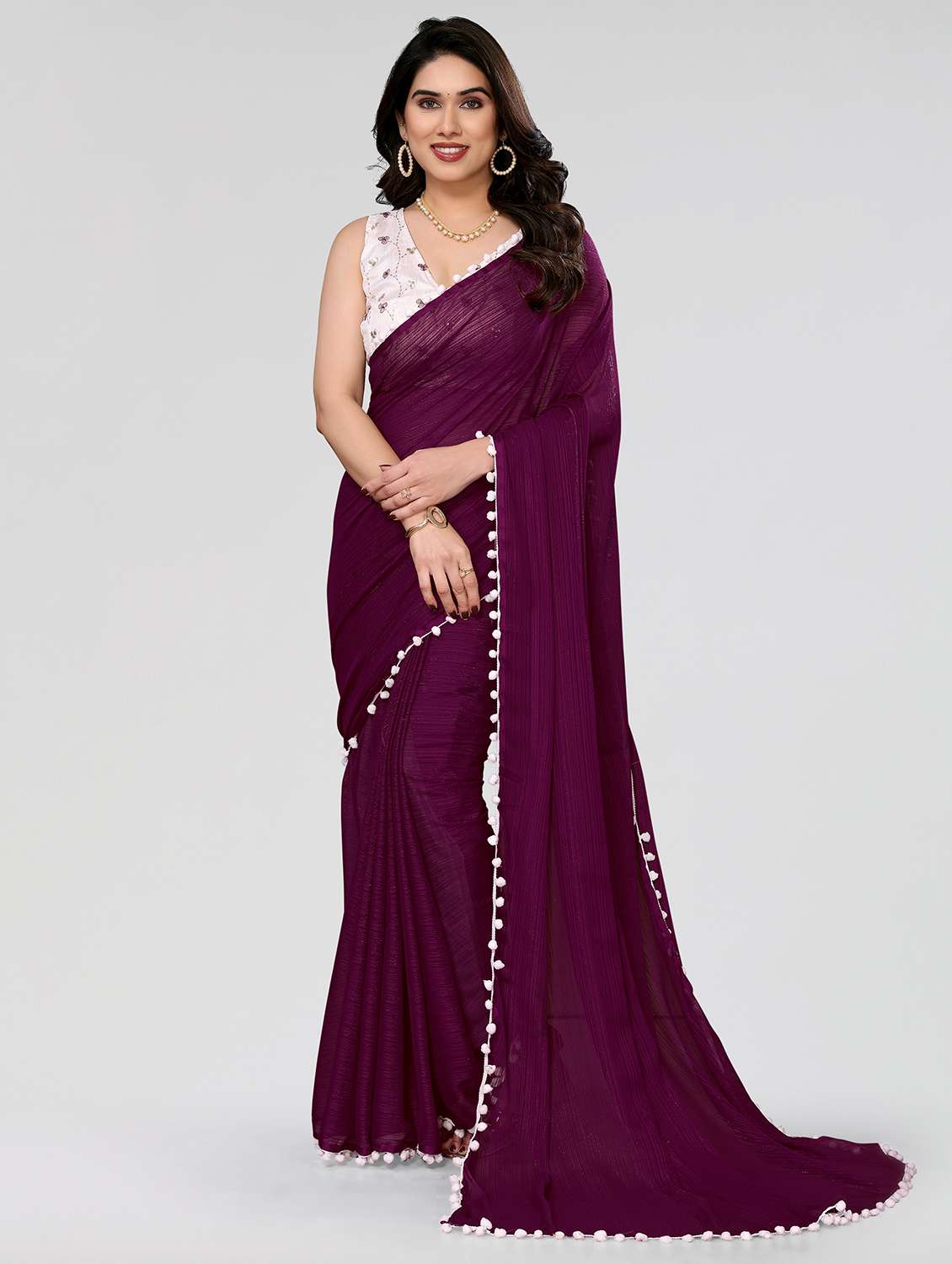 saree features a stunning combination of zari and satin stripes, elegantly adorned with a pom-pom lace border, creating a sophisticated yet playful aesthetic. The rich purple hue enhances its allure, making it a perfect choice for festive occasions and celebrations. Accompanied by an intricately embroidered blouse piece, this saree offers versatility in styling, ensuring a graceful and fashionable appearance for any event.