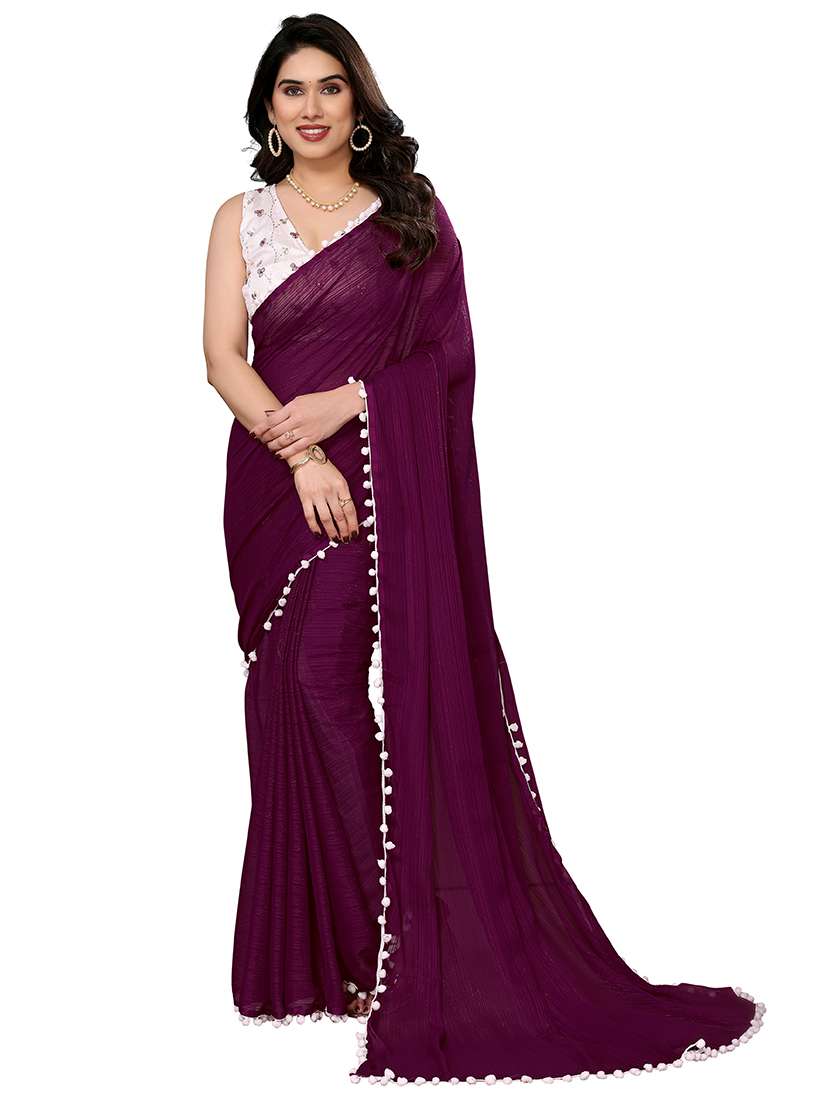 This Attractive saree features a stunning combination of zari and satin stripes, elegantly adorned with a delicate pom-pom lace border. The rich purple hue enhances its luxurious appeal, making it a perfect choice for festive occasions. Accompanied by an intricately embroidered blouse piece, this saree offers a sophisticated and stylish look that is sure to turn heads. Ideal for those who appreciate fine craftsmanship and contemporary design, it is a must-have addition to any wardrobe.