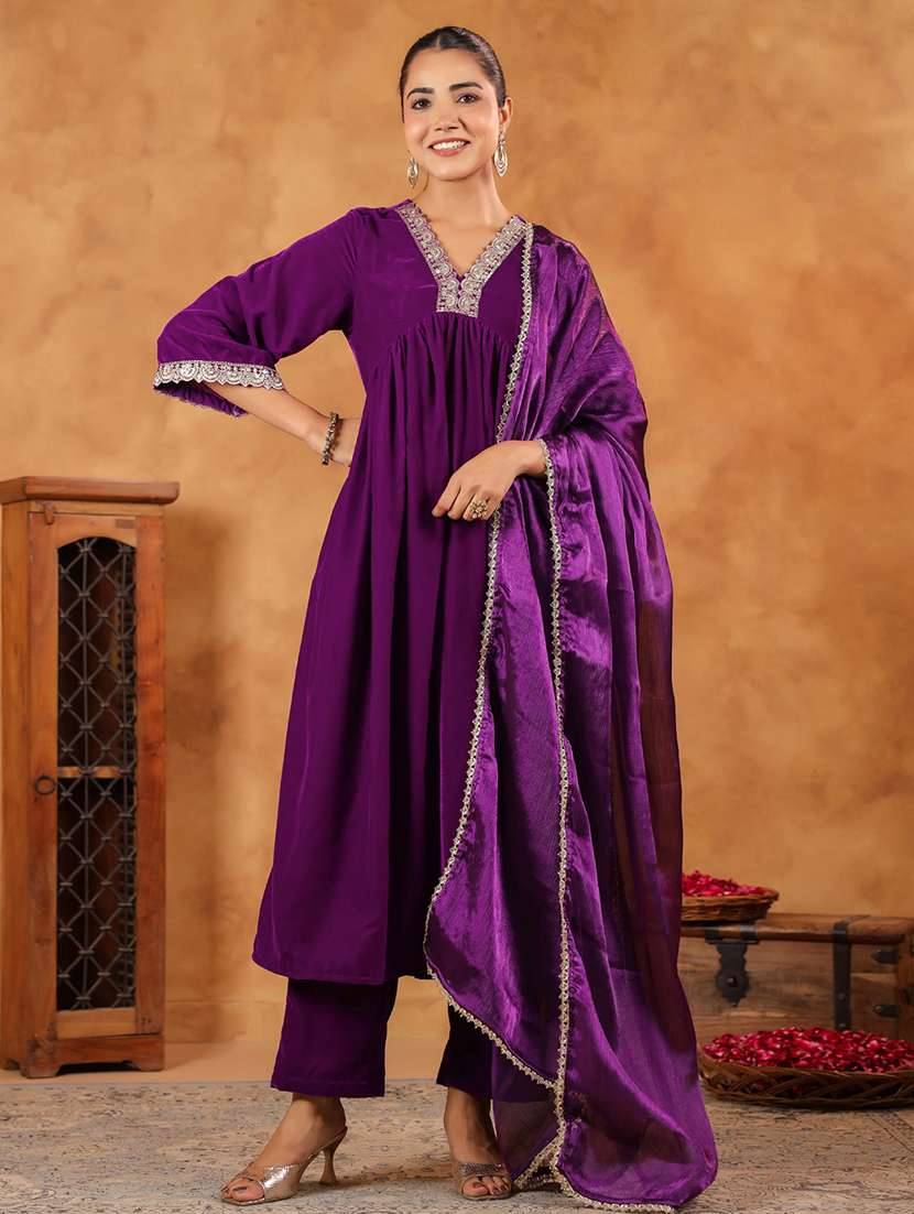 - Find gorgeous sets of ethnic wears in trending designs in purple colors suitable for festive wear of occasions.