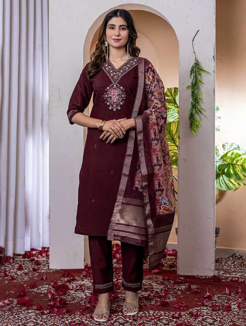 women embroidered three quarter sleeve kurta pant with dupatta set