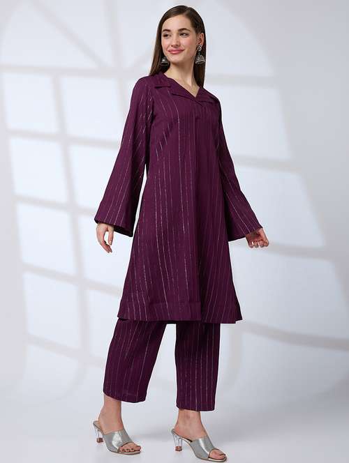 - » globus women purple shimmer woven design notched lapel bell sleeves a-line kurta with pants fusion set