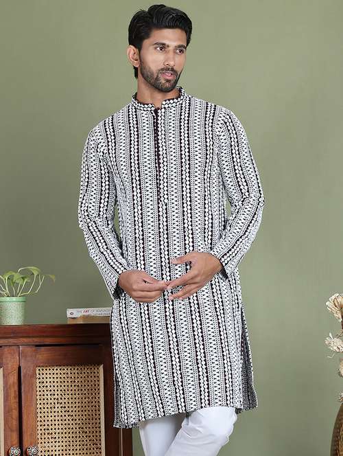 Embroidered and Mirror Work Rayon Kurtas for men. The beautifully designed pattern is sure to impress and the Rayon fabric is comfortable and easy to wear.
