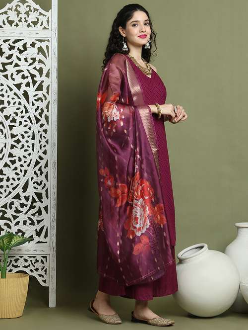 - Find gorgeous sets of ethnic wears in trending designs in purple colors suitable for festive wear of occasions.