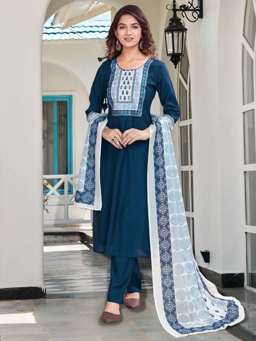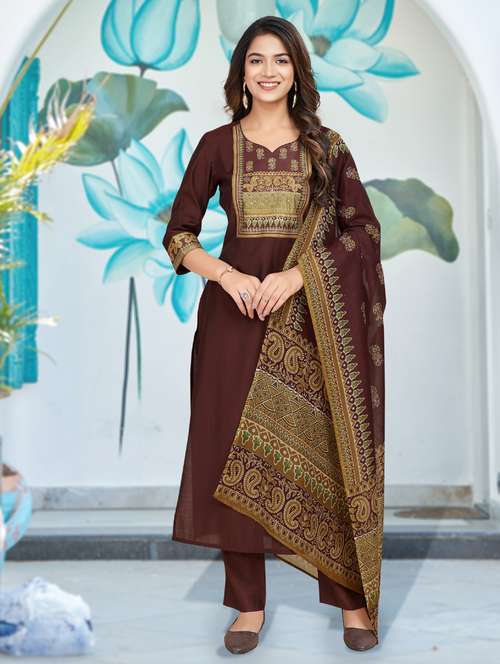 - Browse through the latest range of ethnic sets for women with tailored sleeve designs with traditional works.