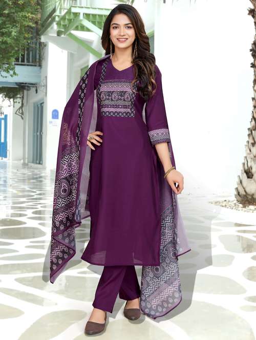 - Find gorgeous sets of ethnic wears in trending designs in purple colors suitable for casual wear of occasions.