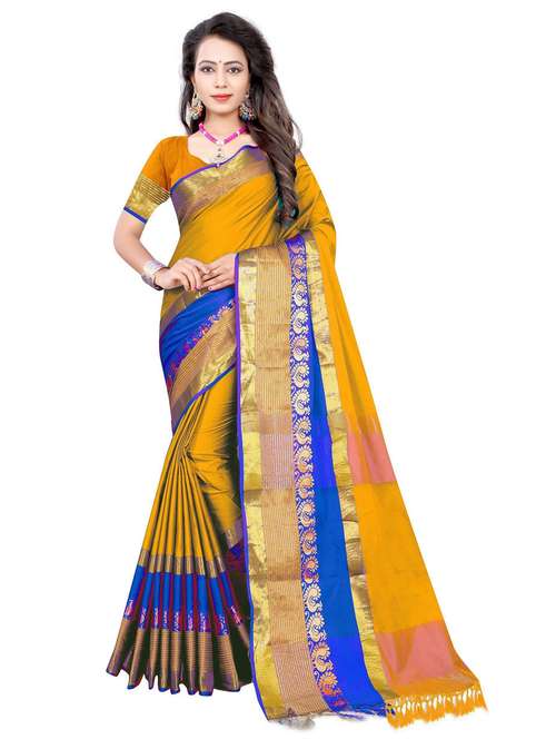 women's bordered yellow colored saree with blouse