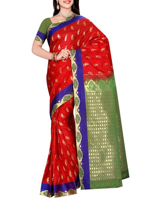 red yellow art silk woven saree with blouse