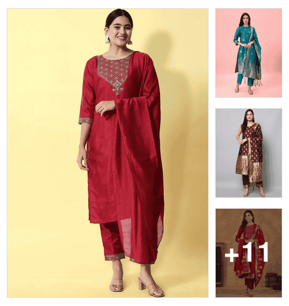 women embroidered three quarter sleeve kurta pant with dupatta set
