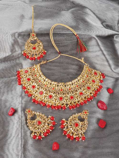 - » red stone studded brass choker necklaces with earring and maangtikka