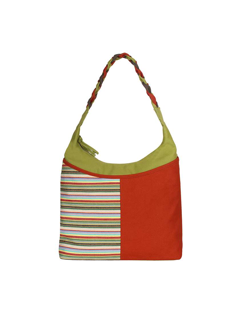 Pink and Green Canvas cotton Pink Shoulder Bag. It has two compartments and one zipper pocket at the Back. It has a multicoloured braided handle which adds to the unique look of this Bag. It comes with a top zip closure and 1 zipper pocket, 1 patch pocket, 1 mobile pocket inside.