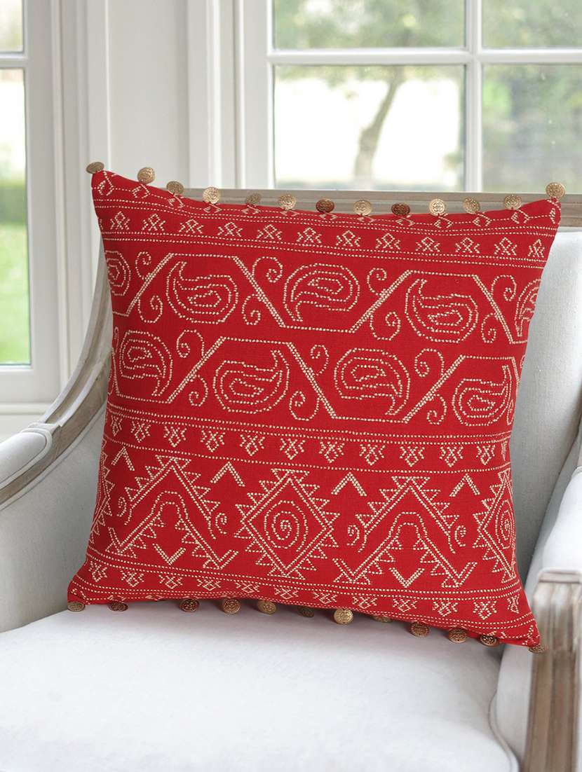 - » mezposh tribal red & gold cotton jacquard ethnic motifs embellished cushion cover (16"x16")