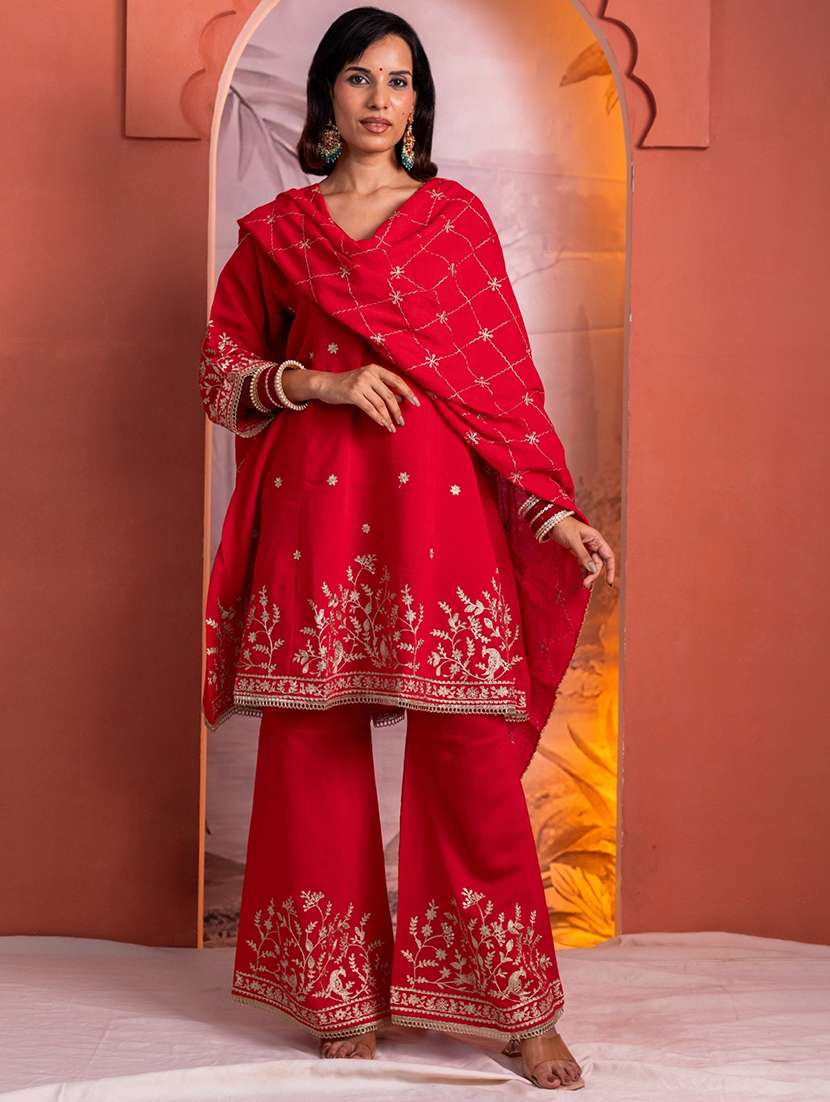 women embroidered three quarter sleeve kurta pant with dupatta set