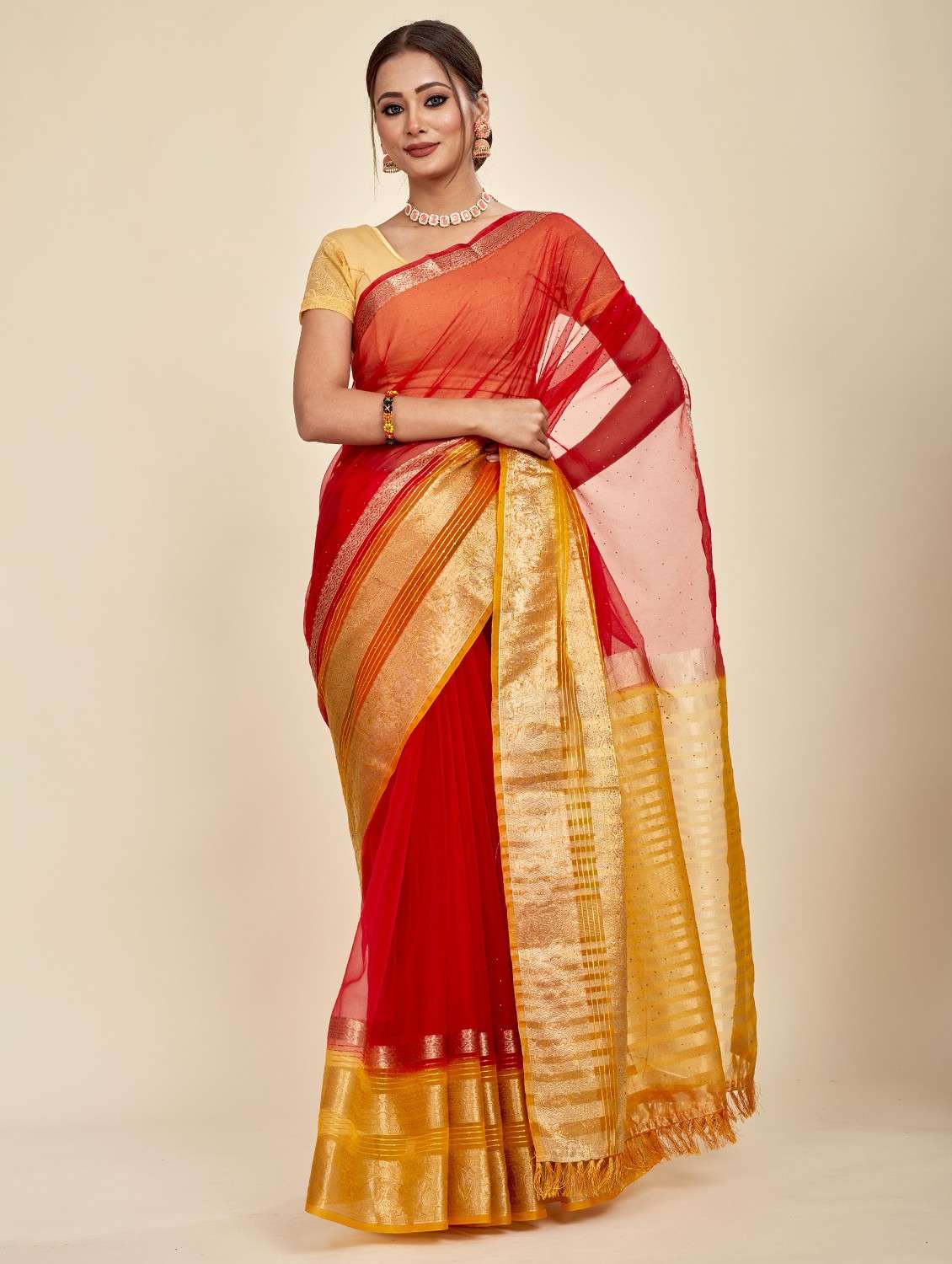 red solid with bordered saree with blouse