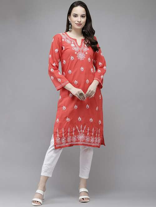- » ada hand embroidered coral red cotton lucknow chikankari kurta
