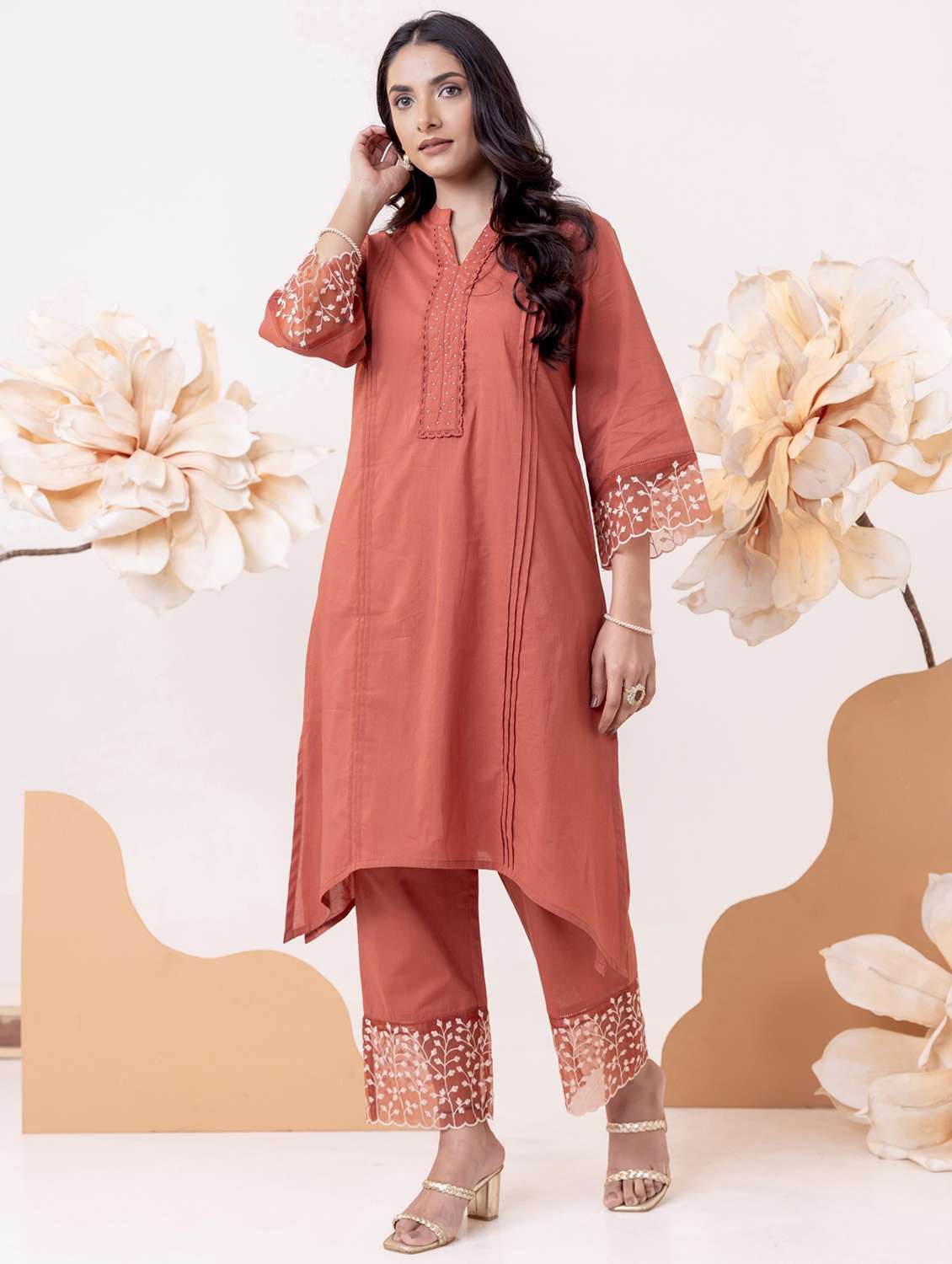 women solid with work three quarter sleeve kurta pant set - 21985486 - Very Small Image - 1