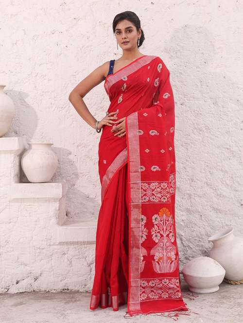 Look royal and loving in this red cotton blend handloom saree. It has zari woven paisey motifs all over along with zari border. The pallu has zari woven floral designs for a beautiful look.