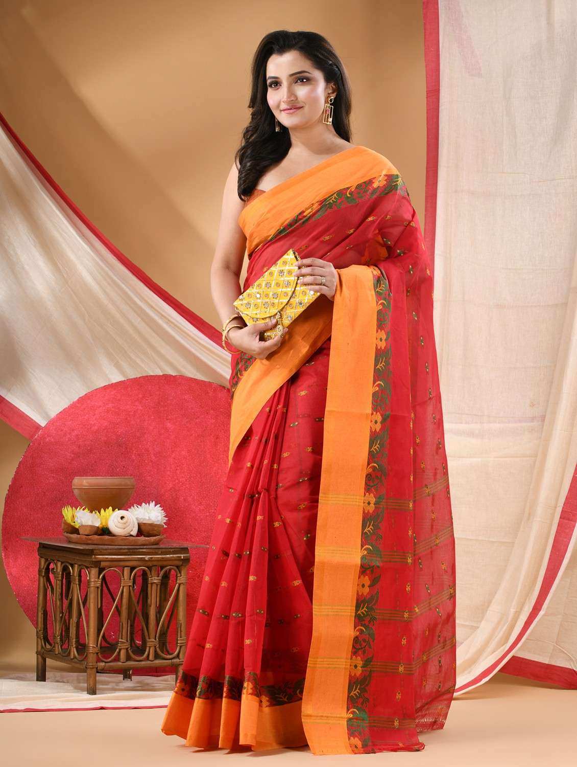 Grace your wardrobe with this pure Tant cotton saree, woven by skilled artisans. Lightweight and breathable, it’s perfect for festive occasions, weddings, parties, or office wear. A blend of tradition and comfort, this handloom drape adds effortless charm to any look.