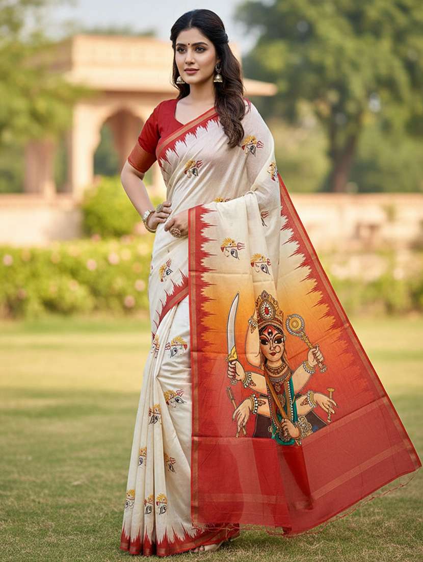 This off-white and red digital printed saree, featuring a magnificent artistic depiction of Goddess Durga on the pallu. Designed with sacred motifs and highlighted with a bold contrast red border, this saree is a true reflection of divine elegance and festive grandeur. Crafted from a soft mul cotton blend, it drapes effortlessly and offers all-day comfort, making it perfect for festive occasions, Durga Puja, Navratri, temple visits, and cultural gatherings. The saree comes with a matching red blouse piece, allowing you to customize it to suit your personal style