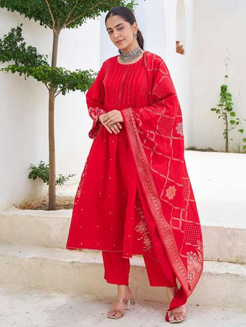 - Find gorgeous sets of ethnic wears in trending designs in red colors suitable for casual wear of occasions.