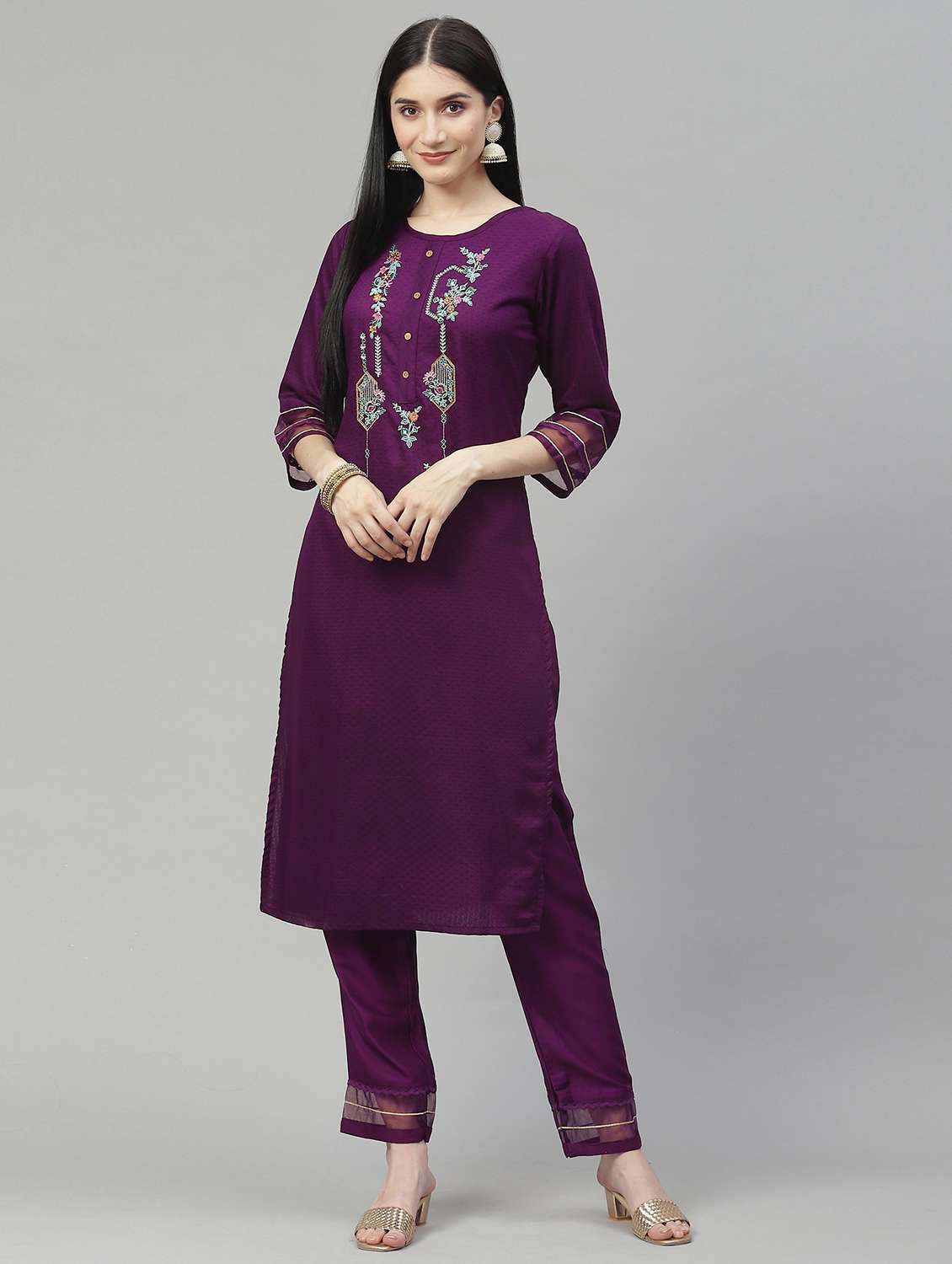 - Browse through the latest range of ethnic sets for women with tailored sleeve designs with embroidered works.