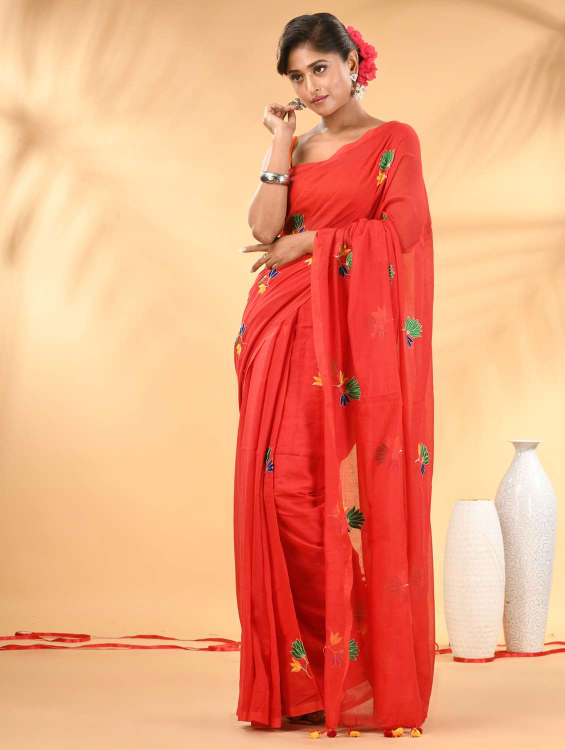 Embrace elegance and comfort with this stunning red mulmul cotton saree, perfect for any casual or festive occasion. The soft and breathable mulmul fabric offers a light and airy feel, making it a perfect choice for warmer climates. The saree is beautifully adorned with vibrant floral embroidery, giving it a refreshing, lively look. The saree’s edges are embellished with charming tassel detailing, adding a playful and chic touch to the overall design. This saree is ideal for those looking to combine tradition with a contemporary flair.