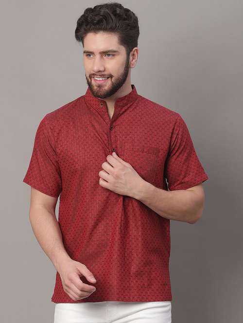 Enchanted Drapes Red Printed Cotton Men's Short Kurta